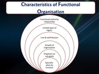 The document discusses functional and product/market organization structures. It describes functional structure as organizing resources by specialized tasks and departments, with advantages being specialization and order but disadvantages including slow decision making. Product/market structure organizes by products and customer groups, allowing a focus on products but with potential for sub-optimization. The document provides details on each structure type, including their suitability for different situations, characteristics, and strengths and weaknesses.