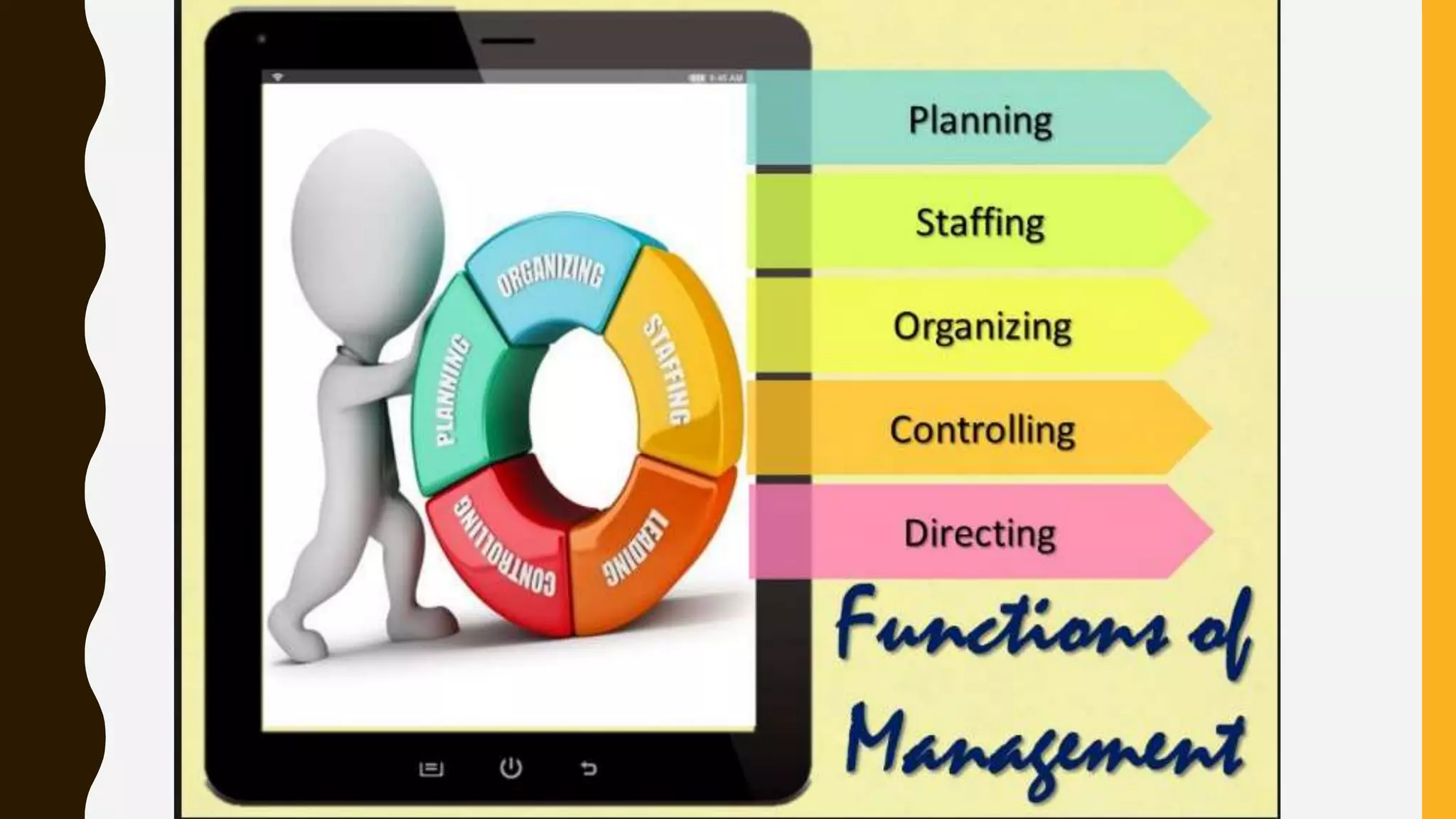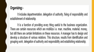 Management involves planning work, organizing resources, leading people, and controlling processes. The document outlines the key functions of management - planning, organizing, staffing, leading, and controlling - and instructs students to match words with each function as an activity. It also reminds students of classroom rules and assignments.