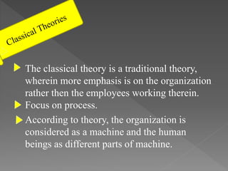 This document provides an overview of several classical and modern theories of organizational behavior. The classical theories such as scientific management, bureaucratic theory, and administrative theory focus on structure and view the organization like a machine. Neoclassical theories incorporate human behavior and relationships. Modern theories take a contingency approach, recognizing that the best organizational structure depends on external environmental factors. The theories aim to understand how organizations function and can be structured for maximum effectiveness.