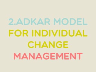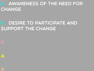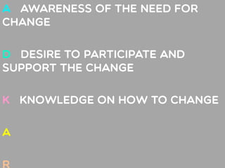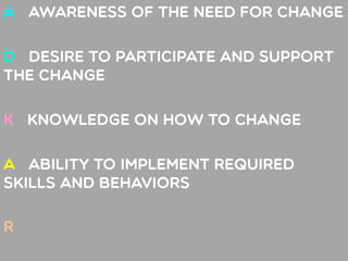 - The ADKAR model focuses on individual change and how it must match organizational change.
