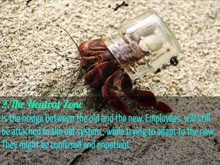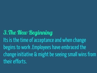 - Lewin's 3-phase model highlights the psychological differences between change and transition.