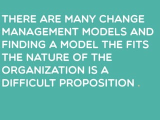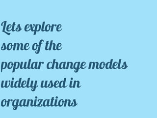 - Kotter's 8-step model includes phases of unfreezing, changing, and refreezing an organization.