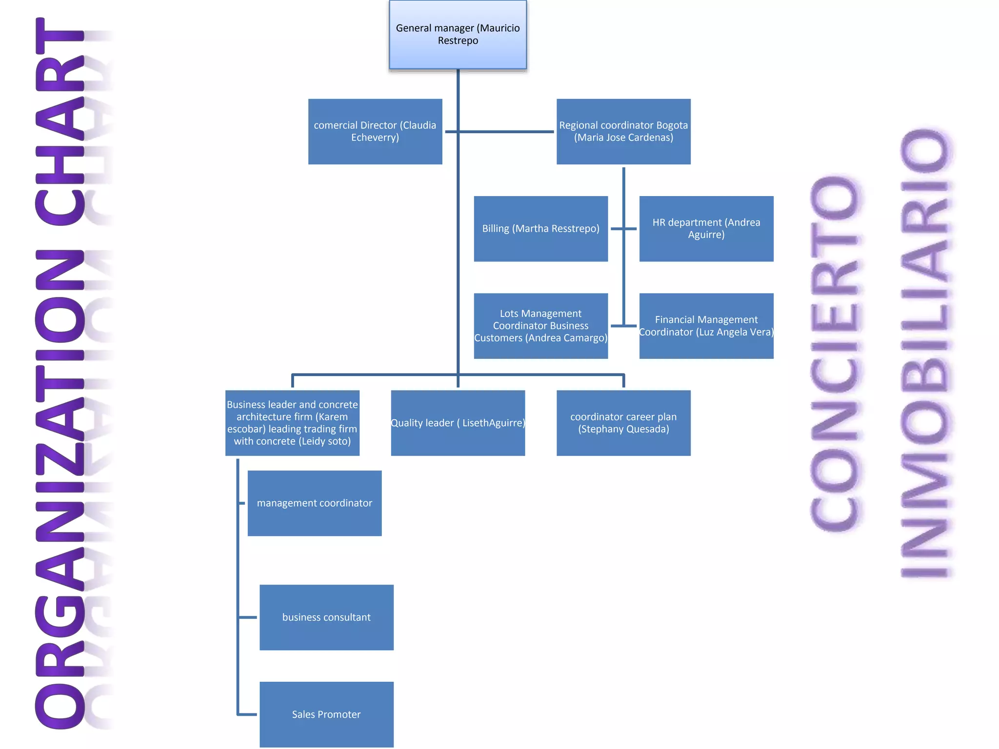 The document lists the positions, names, and roles of various individuals working at a concrete architecture firm and trading company. It includes the general manager, business leader, quality leader, several coordinators for career plans, customers, billing, HR, and financial management, as well as directors of commerce and regional coordinators.