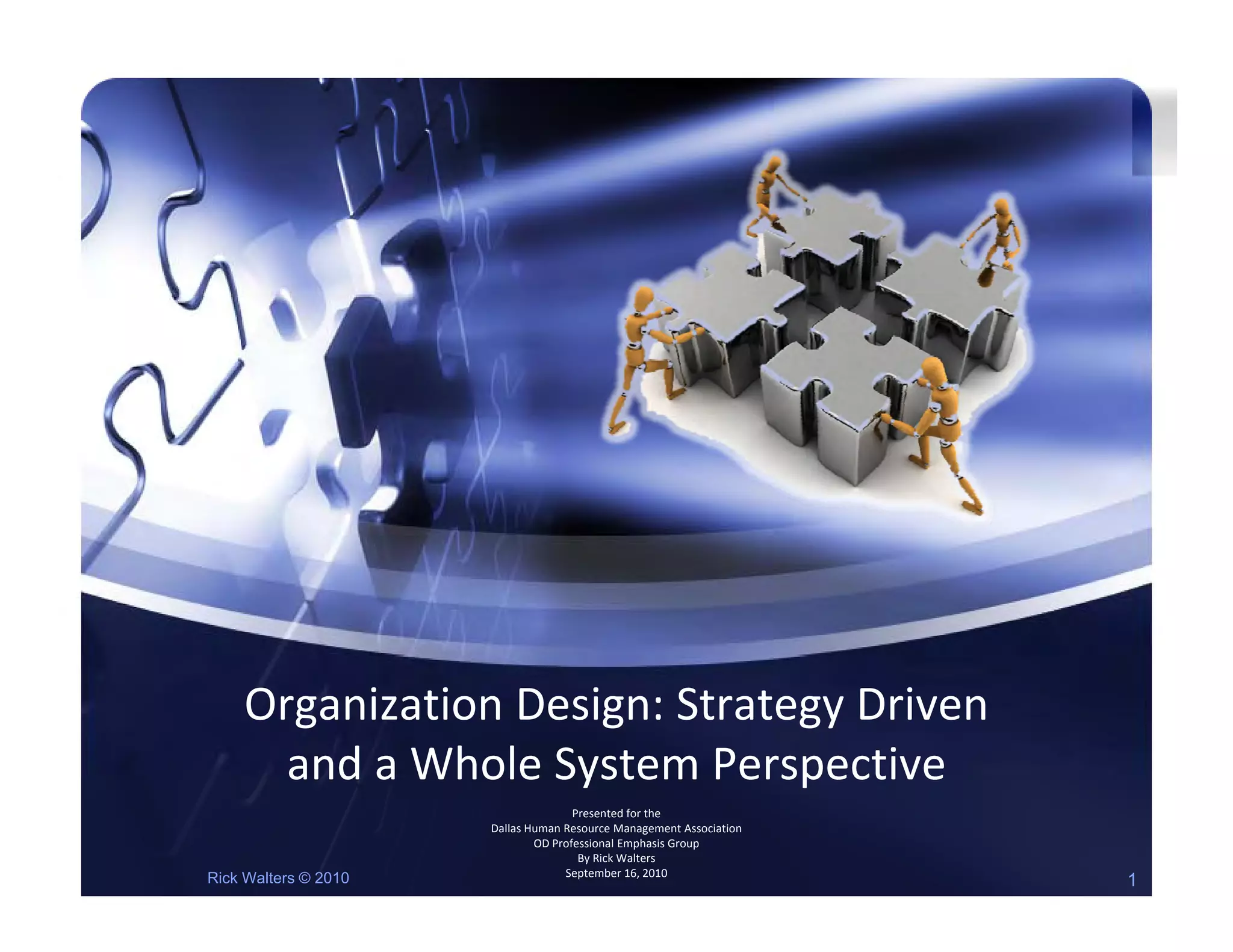 This document summarizes an organization design presentation given to the Dallas Human Resource Management Association. It discusses organization design frameworks, engagement of human potential, and examples of organization design interventions. The document provides an example of an organization that addressed shifts in products/services through workshops identifying common goals, challenges, and initiatives to improve processes, structure, and develop employee capability over multiple years. Key success factors included clear strategy, leadership engagement, and a structured design process.