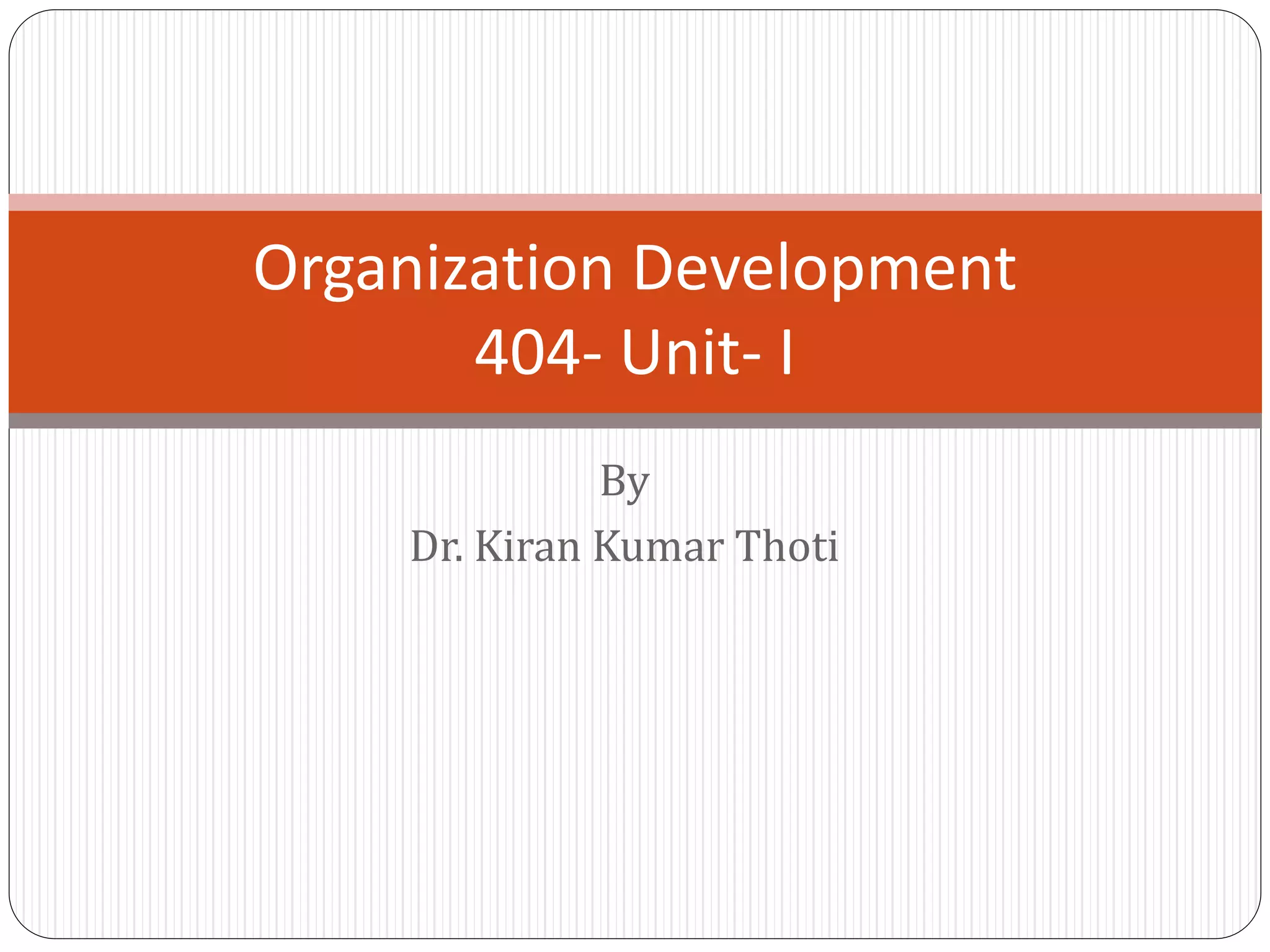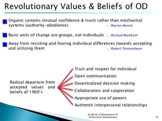 The document discusses Organization Development (OD) as a structured process aimed at enhancing organizational effectiveness and managing change, drawing on various academic disciplines. It covers the historical background, objectives, ethics, characteristics, and values associated with OD, emphasizing the importance of collaboration, humanistic values, and systemic approaches to problem-solving. Furthermore, it highlights the evolution of management practices and organizational transformation, particularly in response to market changes and technological advancements.