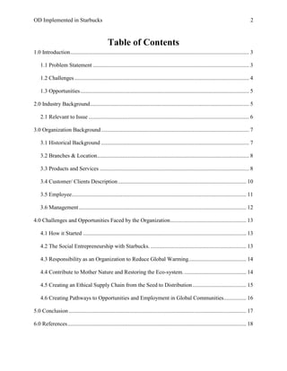 Starbucks has implemented various organization development initiatives to become more environmentally sustainable and socially responsible. Some key initiatives include committing to source coffee ethically and reduce environmental impact through initiatives like using 25% less energy by 2015 in company stores. However, Starbucks faces challenges meeting some of its aggressive sustainability goals due to issues like infrastructure limitations. Starbucks' social responsibility efforts also provide opportunities like attracting employees who share its values and enhancing its brand image with consumers.