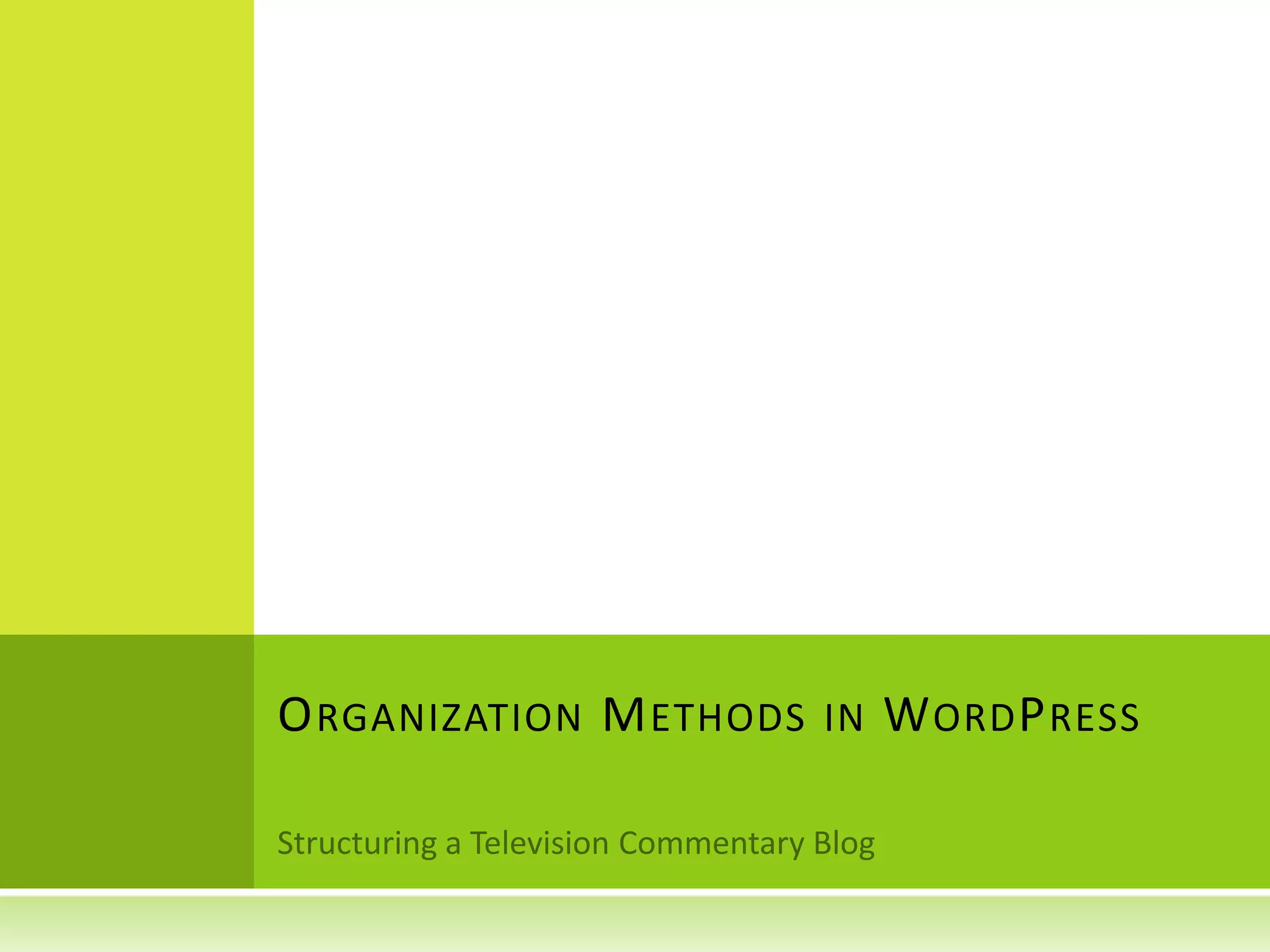 The document discusses various organization methods in WordPress including pages, posts, categories, tags, custom post types, taxonomies, and postmeta. Pages are for static content while posts are for regularly updated content. Categories and tags help with ordering and search engine optimization. Custom post types create customized content types, and taxonomies further group custom post types. Postmeta allows for additional sorting of content. The document recommends planning an organization structure tailored to each site's specific needs and content.