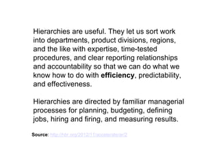 The document explores the concept of rethinking organizational structures, emphasizing transparency, creativity, and autonomy over traditional hierarchical models. It suggests that organizations should foster environments where individuals can try out ideas, make decisions autonomously, and engage in cross-functional teamwork to enhance innovation and responsiveness. Additionally, it discusses the importance of keeping content accessible and supporting ongoing development through fair contributions.