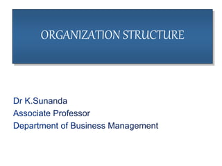 Organizational structure is the framework that specifies relationships between people, work, and resources within an organization. The span of management, or number of subordinates one manager can oversee, largely determines the structure and levels of hierarchy. Tall structures have many levels and a narrow span of control, while flat structures have few levels and a wide span of control. Decision making is faster in flat structures due to their wide span of control, while tall structures provide more opportunities for promotion but involve higher costs and slower decision making across many levels. Delegation of authority and decentralization of decision making can help make structures more effective and motivate employees. Common organization designs include functional, divisional, and matrix structures.