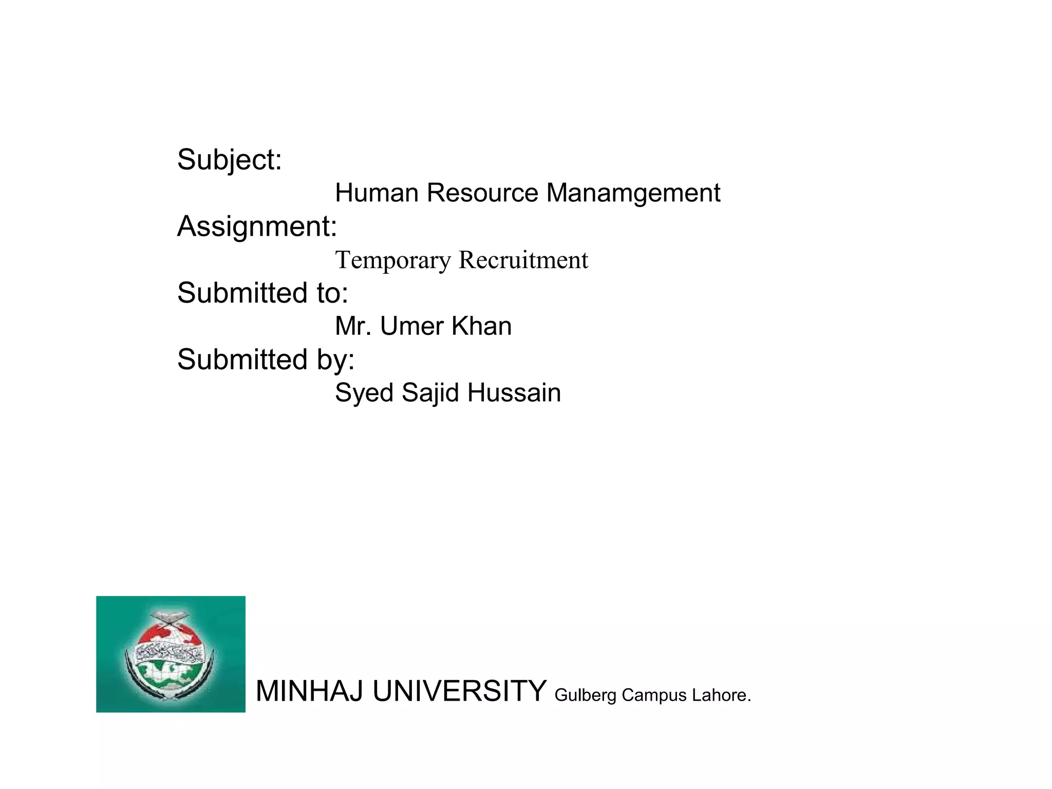 The document discusses temporary recruitment and the benefits of temporary workers. It defines a temporary worker as someone employed for a limited period where the job is expected to last a short time. Temporary workers are recruited and selected by agencies and hired out to employers. The benefits of temporary workers include addressing temporary demand, maintaining staff flexibility, covering for employee absences, accessing specialist skills, handling overload work, and training needs. However, there are also challenges like low focus on goals, instability without job security, and legal concerns. The document also lists benefits for temporary employees like money, variety, flexibility, efficiency, productivity, opportunities, work location, and building relationships/references.