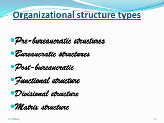 This document discusses different types of organizational structures, including pre-bureaucratic, bureaucratic, post-bureaucratic, functional, divisional, and matrix structures. Pre-bureaucratic structures lack standardization and are common in small organizations. Bureaucratic structures have more standardization and are better suited for larger organizations. Functional structures group employees by specialized tasks while divisional structures group functions into divisions based on factors like geography or products. Matrix structures combine functional and divisional forms by grouping employees by both function and product/division.
