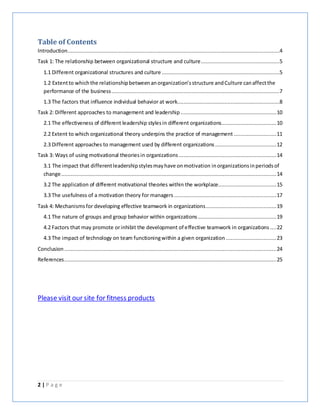 This document provides an organizational behavior analysis of ASDA PLC and British Airways. It discusses the relationship between organizational structure and culture, and how factors like structure, leadership style, management approaches, and motivation theories impact individual and group behavior within an organization. The document analyzes how ASDA and British Airways' structures, cultures, leadership styles, and other aspects compare and influence performance. It also explores relevant organizational behavior concepts and theories.