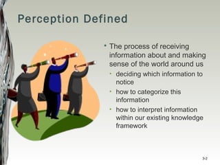 This document discusses perception and learning in organizations. It defines perception as the process of receiving information and making sense of the world. Selective attention and confirmation bias can influence what information we notice and believe. Mental models help us interpret information but can also block new perspectives. Learning is a relatively permanent change in behavior from interacting with the environment. Both explicit knowledge from documents and tacit knowledge from experience are important. Behavior modification uses reinforcement to change behavior, while social learning emphasizes modeling and self-reinforcement. Organizational learning involves acquiring, sharing, and applying knowledge across an organization.