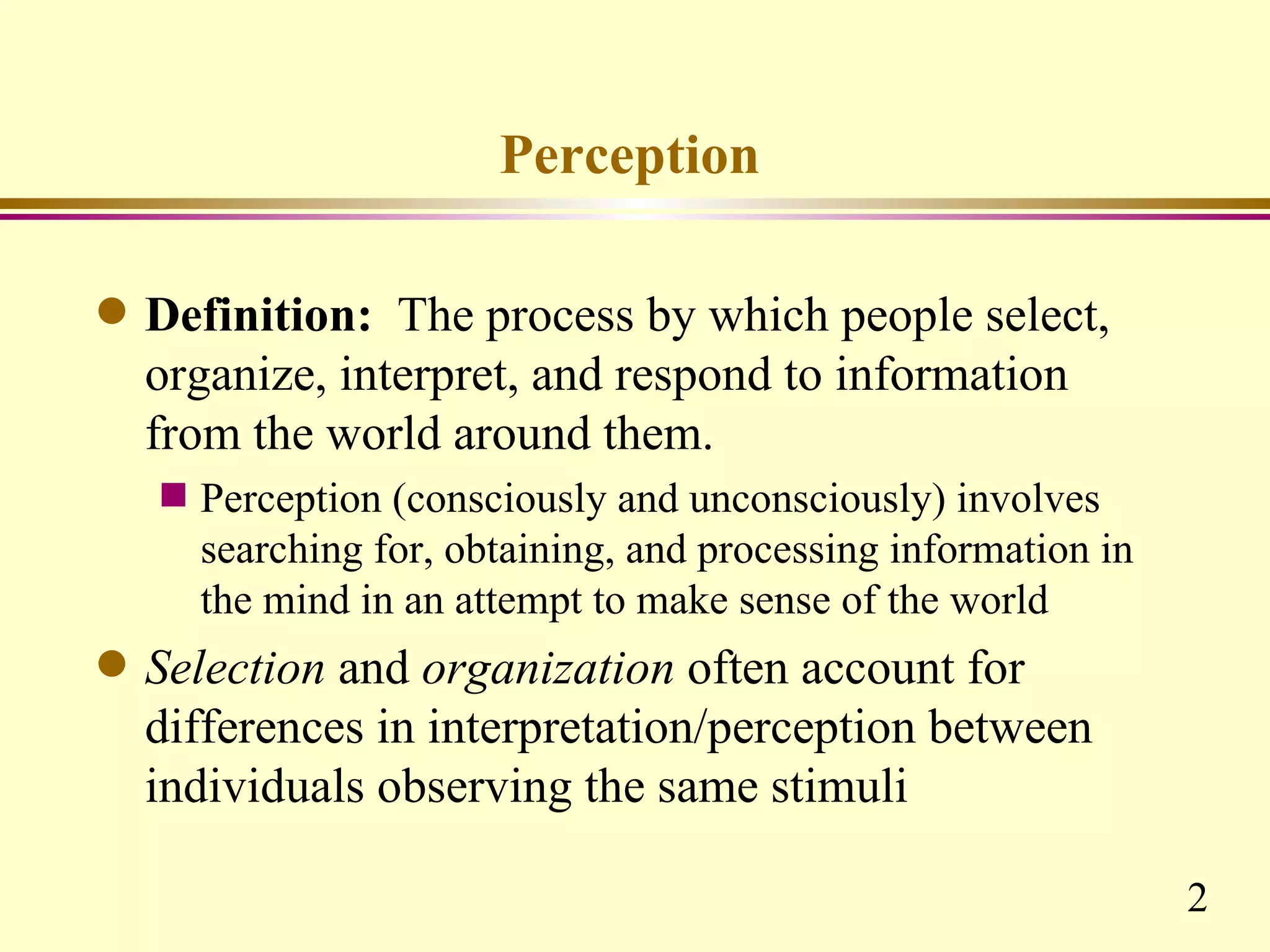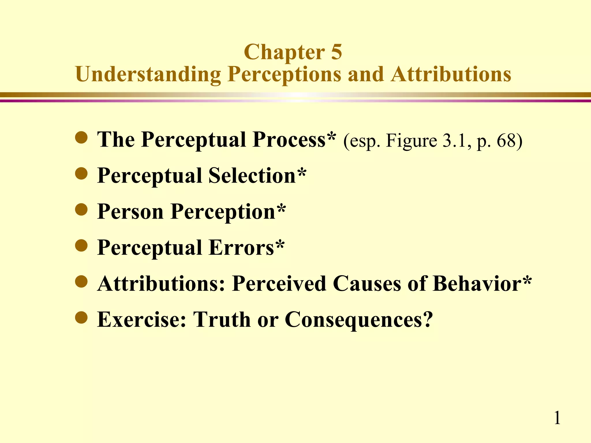 This chapter discusses key concepts related to perception and attribution. It defines perception as how people select, organize and respond to information. Perception involves observation, selection, organization, interpretation and response. Common perceptual errors include stereotyping, halo effect, and projection. The chapter also defines attribution as how people understand the causes of behaviors. Attributions can be internal or external. Frequent attribution errors include the fundamental attribution error and self-serving bias.