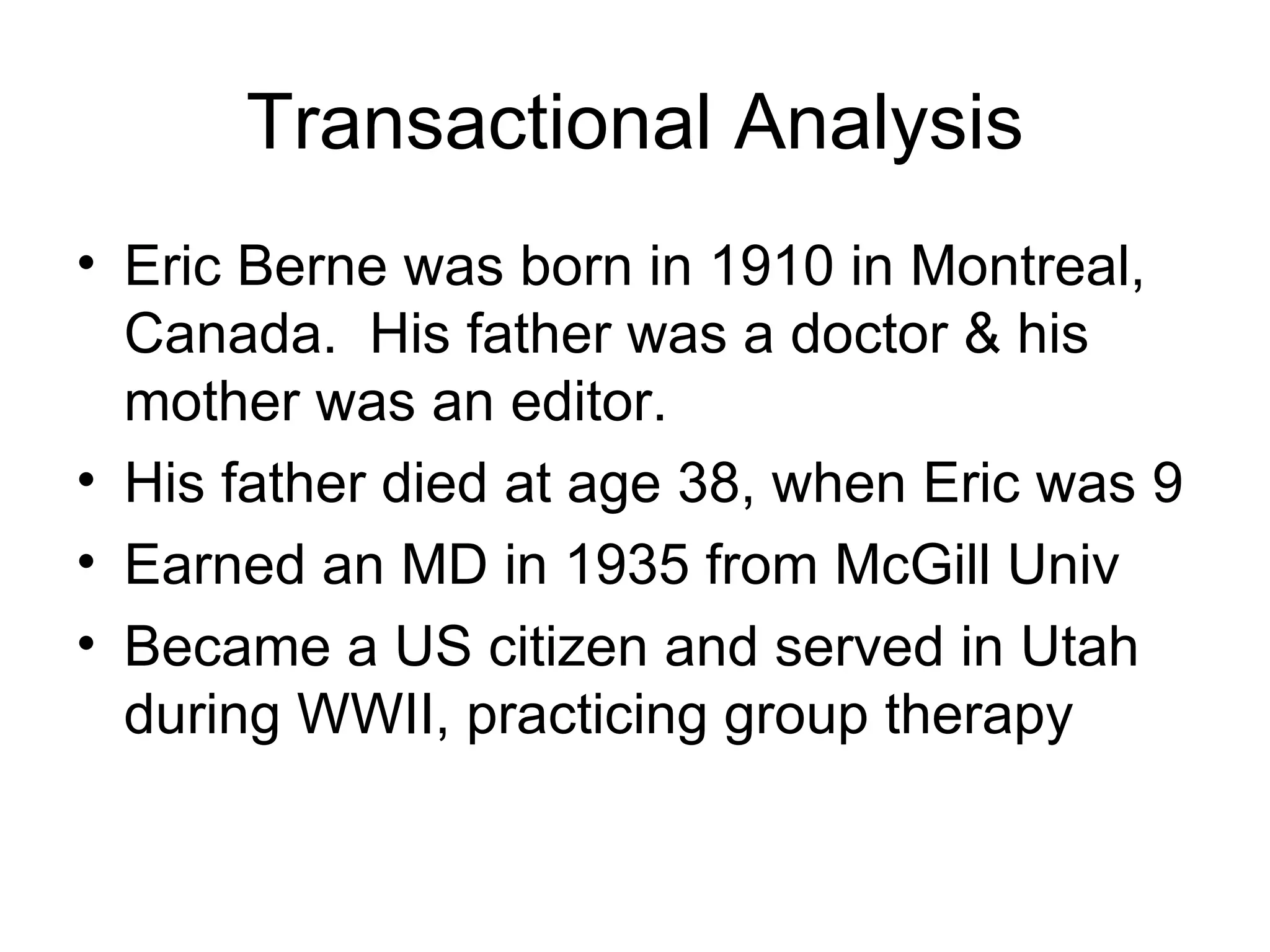 Eric Berne developed transactional analysis which examines human behavior and interactions between people. He identified different ego states like the natural child, adaptive child, nurturing parent, and critical parent. Transactions can be complementary, crossed, or ulterior. Berne also developed concepts of games people play, script analysis to understand how early experiences shape one's life plan, and different methods like structural analysis, transactional analysis, game analysis, and script analysis.