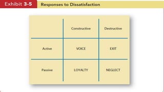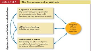 This document discusses organizational behavior and personality. It defines organizational behavior as understanding, predicting, and managing human behavior in organizations to achieve goals. Personality is described as relatively permanent characteristics that make individuals unique. Several approaches to understanding personality are discussed, including trait, learning, and social cognitive approaches. The "Big Five" model of personality traits - openness, conscientiousness, extraversion, agreeableness, and neuroticism - is also summarized. Attitudes and major job attitudes like job satisfaction, involvement, and commitment are defined. Sensation versus perception and components of attitudes are also outlined.