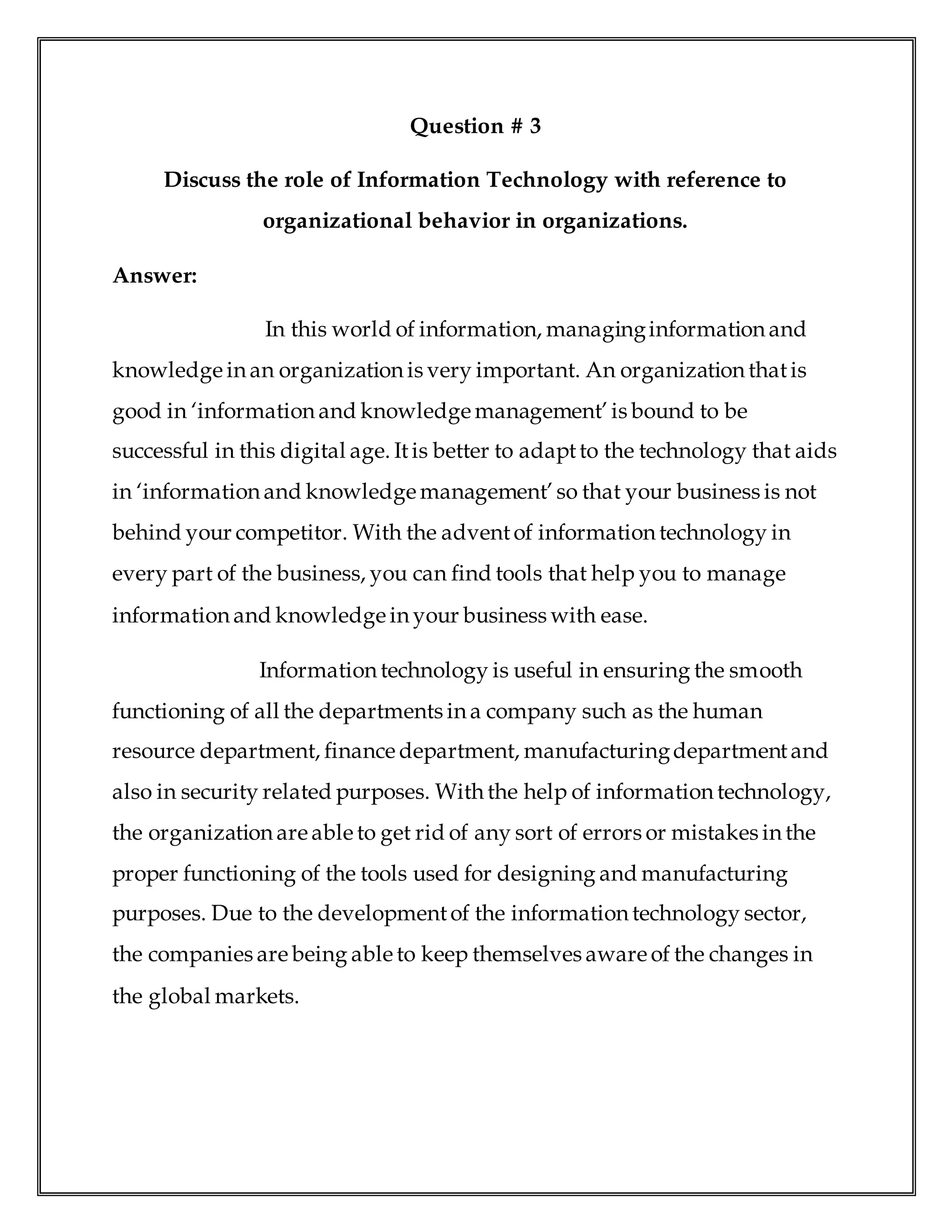 Information technology plays a key role in organizational behavior by enabling information capture, storage, manipulation, and distribution. It affects organizational culture, structures, management processes, work, and the workplace. Specifically, IT allows for more open information sharing, flatter structures, improved decision making, changing work nature, and flexible work arrangements. Its impact depends on factors like new products/services, costs, adoption timelines, risks, demand expectations, and technical limitations. Overall, IT improves quality, differentiation, efficiency, and global operations while reducing costs through automation. It provides a competitive advantage and is increasingly important due to competition, globalization, organizational changes, and advancing technology.