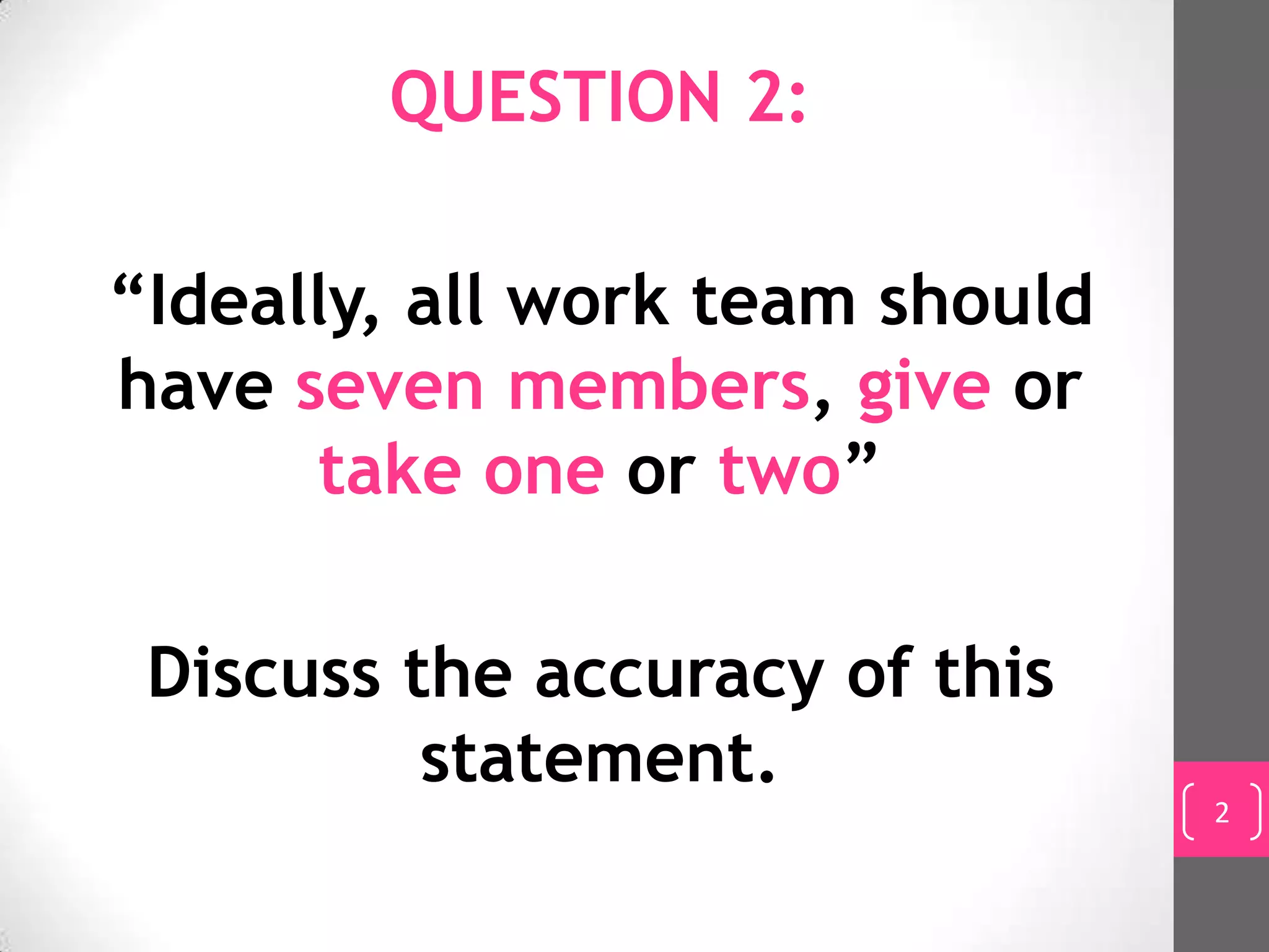 The statement that ideally all work teams should have seven members, give or take one or two, is generally accurate. While team size can depend on the task and composition, research has shown that smaller teams between 6-9 members operate most effectively. Larger teams face issues with coordination, engagement, and influence among members. Effectiveness is highest when teams are small enough for meaningful involvement from all, while providing the necessary competencies and perspectives to accomplish goals.