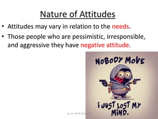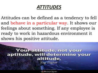 The document discusses attitudes, their definitions, components, types, and factors that influence them, such as environment, experience, and education. It emphasizes that attitudes can be changed and provides steps to foster positive attitudes, including controlling one's thoughts and seeking supportive environments. Several scenarios are presented to illustrate how attitudes can shape behavior in various situations.