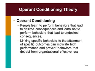 This document discusses learning and various theories of learning. It begins with definitions of learning as involving changes in behavior due to experience. It then discusses the nature of learning, including that changes must be relatively permanent and based on practice or experience. It outlines components and factors that affect learning. Four main theories of learning are described: classical conditioning, operant conditioning, cognitive learning theory, and social learning theory. Classical conditioning involves acquiring new responses to stimuli through repeated associations. Operant conditioning examines how consequences influence voluntary behaviors. Cognitive learning theory views learning as gaining understanding through absorbing information. Social learning theory posits that people learn from observing and imitating others.