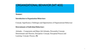 This document outlines the course content for an Organizational Behavior course. It includes 5 modules that will cover topics such as introduction to OB, motivation, groups and teams, leadership and communication, and organizational change and stress. The modules will explore concepts from each topic in 3-5 class sessions and recommended textbooks are provided. The course aims to help students understand individual and group behavior in organizations and apply OB principles to improve organizational effectiveness.