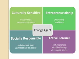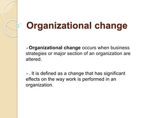 The document discusses various aspects of organizational change including defining organizational change, change management, forms of change (planned, unplanned, radical, transformational), forces for change (external and internal), resistance to change and strategies for managing resistance. It also summarizes approaches to managing organizational change including Lewin's three step model, Kotter's eight step model, action research and organizational development. Finally, it discusses creating a culture for change and innovation in organizations.