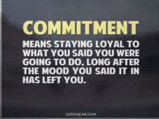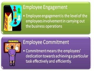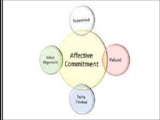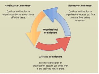 Organizational commitment refers to an employee's psychological attachment to an organization. There are three main types of organizational commitment: affective commitment which involves an emotional attachment to the organization; continuance commitment which is based on the costs associated with leaving the organization; and normative commitment which involves a feeling of obligation to the organization. Factors like job characteristics, leadership, relationships, and work environment can influence an employee's level of organizational commitment. Higher organizational commitment is generally associated with positive outcomes for both employees and organizations.
