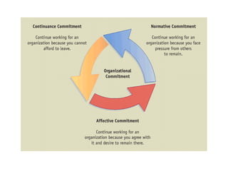 Organizational commitment refers to an employee's identification with and involvement in an organization. There are three main types of organizational commitment: affective, continuance, and normative. A survey of IT employees found moderate levels of organizational commitment, with higher variability in affective commitment. Job satisfaction was also moderate, with the lowest satisfaction regarding working hours, supervision, appreciation, and salary. Higher job satisfaction correlated with increased affective and normative commitment.