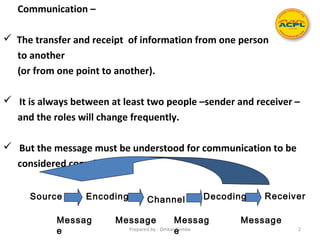 The document discusses key aspects of organizational communication, emphasizing the importance of etiquette, ethical communication, and effective telephonic and written exchanges. It outlines guidelines for telephone manners and the structured process for written communication based on escalating issues within an organization. Respect, clarity, and professionalism are essential components highlighted throughout the document.