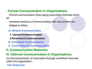 This document discusses different types of organizational communication. It describes formal communication as flowing through prescribed channels, including vertical communication up and down the hierarchy as well as horizontal communication between peers. It notes limitations of downward, upward, and horizontal formal communication. Informal communication is defined as occurring through nonofficial channels, including the grapevine, which is an informal method of spreading information.