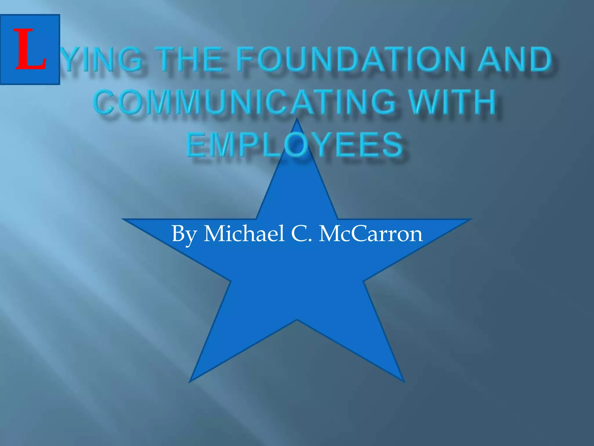 The document outlines four steps for laying a strong foundation for communication with employees: (1) create a sense of ownership among all employees, (2) integrate management and work responsibilities, (3) widely distribute quality information, and (4) allow the social structure to develop from lower levels rather than being imposed from above. It then discusses the importance of onboarding and motivating employees through effective communication and cites a failed organization that did not establish strong communication foundations.