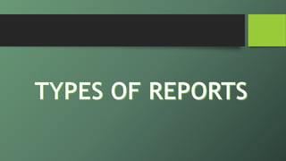 The document discusses the key elements and purpose of organizational reports. It defines reports as documents that record and convey information to readers. There are two main types of reports - informational reports, which present facts without analysis, and analytical reports, which present information with comprehensive analysis. Reports are typically organized around six key elements - who, what, where, when, why, and how. Common report elements include a title, abstract, introduction, body, conclusion, references, and appendix. The function and audience should determine the specific format and organization of a report.