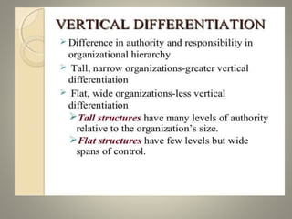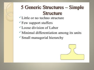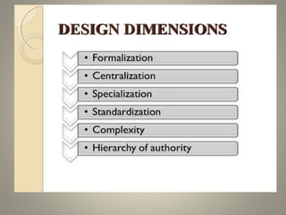 This document discusses organizational design and structure. It covers topics such as organization structure, design, factors affecting design decisions, differentiation both horizontally and spatially, integration both vertically and horizontally, and models of organizational structure including machine bureaucracy, divisionalized form, and adhocracy. The document provides an overview of key concepts for designing organizational structure.