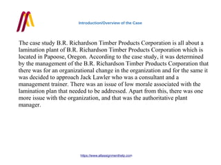 The case study focuses on the B.R. Richardson Timber Products Corporation's lamination plant in Papoose, Oregon, highlighting issues related to low employee morale and an authoritative management style. The document suggests that a healthy organizational culture and improved communication are essential interventions to boost morale and productivity. Recommendations include establishing open communication and motivating employees to enhance overall organizational performance.