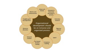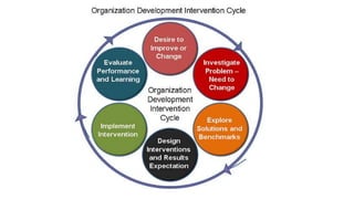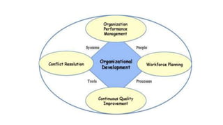 This document discusses organizational development (OD). It defines OD as a planned, systematic process aimed at improving an organization's effectiveness by implementing interventions at the individual, group, and structural levels. The key goals of OD are to align organizational elements with strategy, maintain organizational health, and improve capability. OD requires the involvement of all organizational levels and is led by an OD practitioner. The roles of an OD practitioner include diagnosing issues, facilitating change interventions, and evaluating impact. The document also explores the relationship between OD and human resource development (HRD), noting they work together but have distinct roles in driving organizational change.