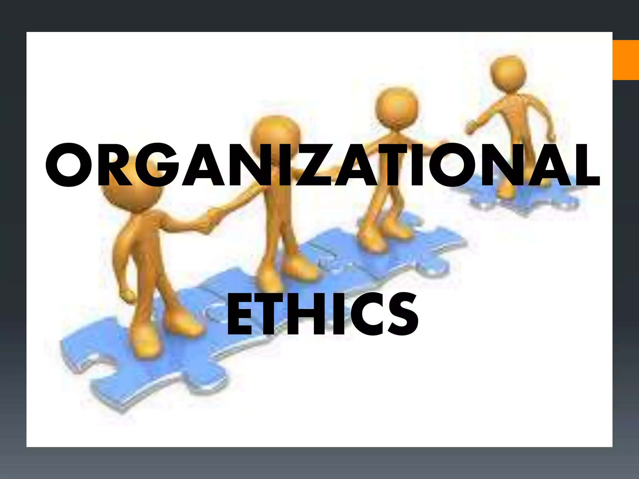 Organizational ethics refers to applying moral choices guided by values and principles to organizational activities. An ethical organization has fairness, responsibility, purpose, and ease interacting with diverse stakeholders. Ethical ground rules foster honesty, responsibility, fairness, and participation. Managing ethics improves society, productivity, meaning, policies, reputation, and trust. Leaders are responsible for creating ethical organizations by confronting operational goals with moral obligations. Leaders must consider impacted values and interests and avoid harm. Building ethics requires leaders to develop influences, integrity, values, training, and plans for excellence. An organization's ethics reflect its leaders' ethics and skills.