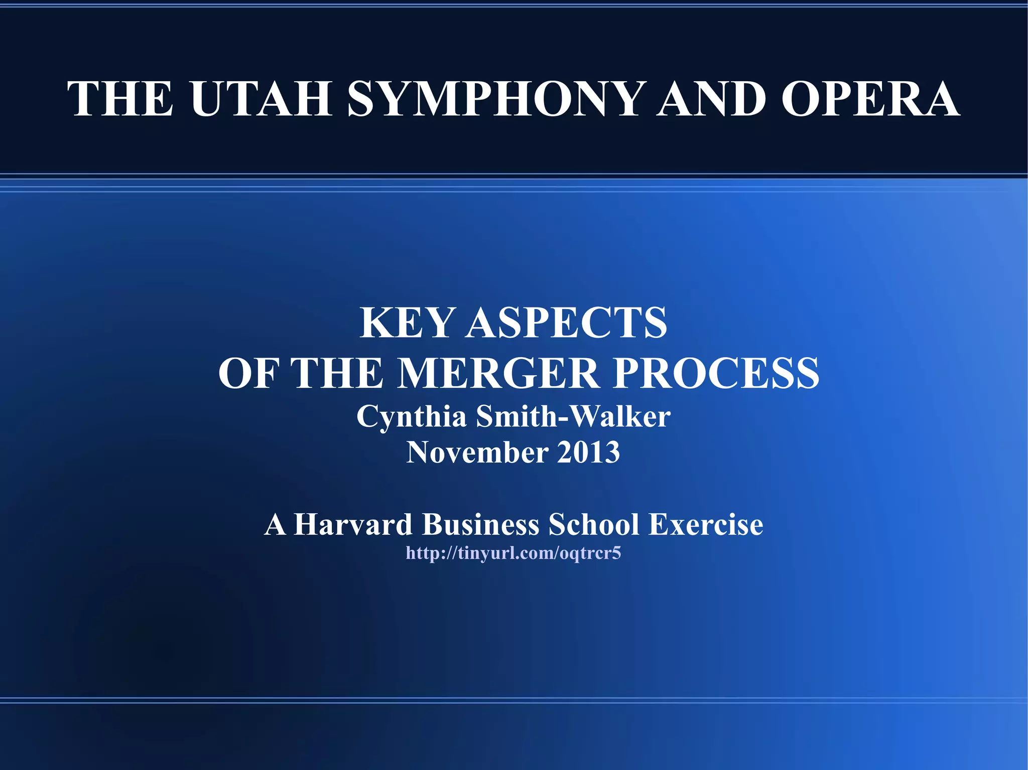 The document discusses key aspects of merging the Utah Symphony and Opera organizations. It addresses issues like organizational culture, audience strategy, and technology integration. The Symphony has a top-down structure while the Opera empowers employees. Both organizations must accept weaknesses and be willing to change. Audience messaging should establish common ground and discuss benefits. Technology like Microsoft Office and PeopleSoft can support integration, reduce expenses, and enable synergies during the merger process.