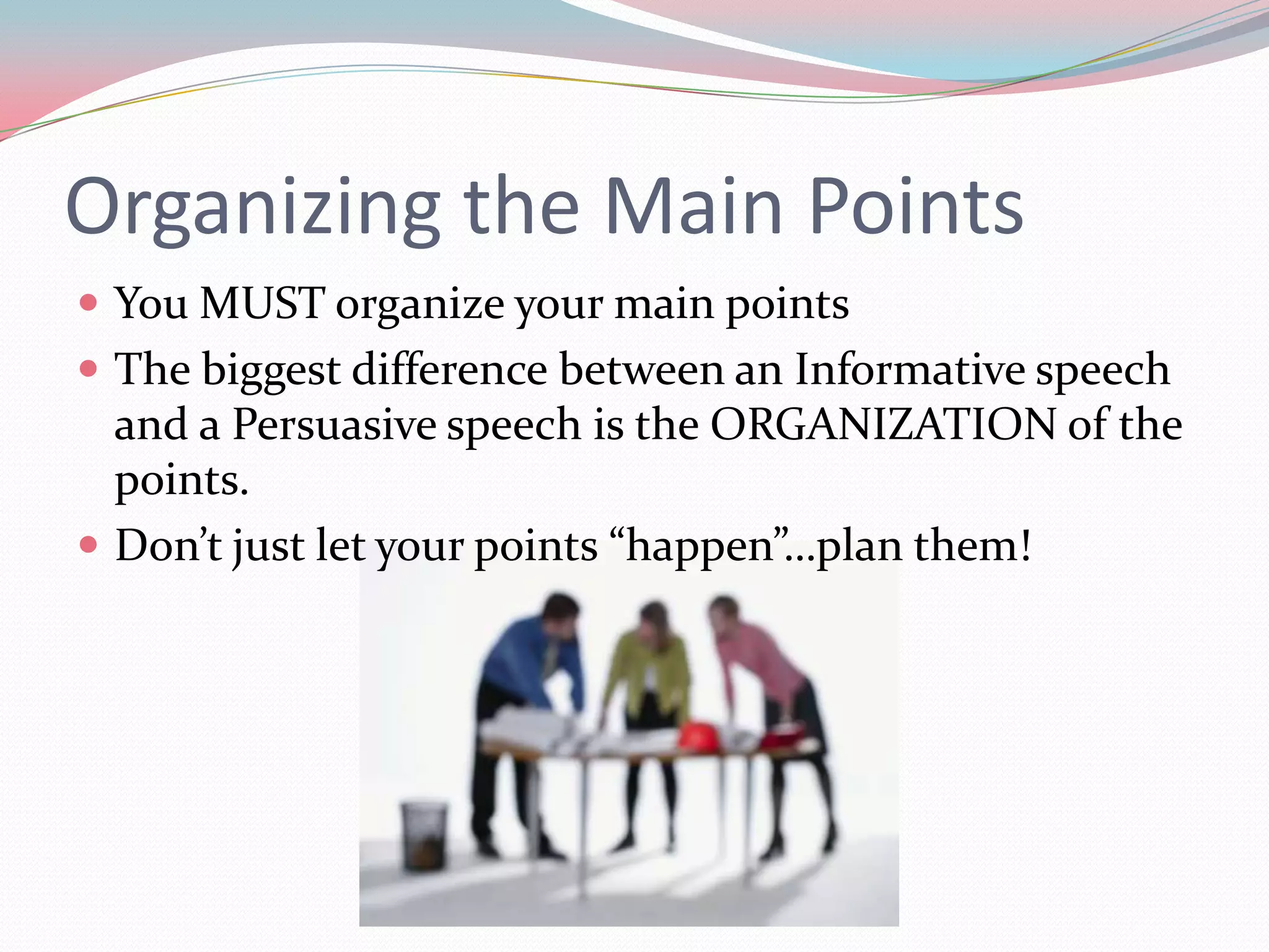 This document discusses strategies for organizing the main points of informative and persuasive speeches. It describes common patterns such as chronological order, categories/topics, geographical order, cause and effect, problem and solution, claims, refutation, and the motivated sequence. The key difference between informative and persuasive speeches is that persuasive speeches call the audience to take some kind of action.