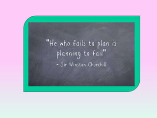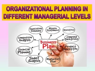 The document discusses various types of organizational plans. It defines a plan as a blueprint for attaining goals through allocating resources and scheduling actions. There are different levels of plans, including strategic plans that outline steps for the entire organization over 2-5 years, tactical plans for lower units over 1 year, and operational plans with specific measurable goals for departments. The planning process begins with developing a mission statement and strategic goals, then identifying internal/external factors in a SWOT analysis to define new missions, goals, and grand strategies. Lower levels then create compatible tactical and operational objectives to achieve the strategic plans.