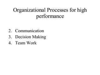 The document discusses frameworks for designing high-performance organizational processes related to communication, decision-making, and teamwork. It covers topics such as effective communication media matching complexity levels, types of organizational decisions, rational models of decision-making, and participative and group decision-making techniques.