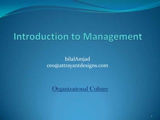 The document discusses organizational culture, describing it as shared values, principles, traditions, and ways of doing things that influence employee behavior. It identifies dimensions of culture like innovation, detail orientation, and teamwork. Strong cultures have widely shared values that guide behavior, while weak cultures lack shared values. Culture is shaped by founders and management practices, and learned through stories, rituals, symbols and language. Culture affects managerial functions like planning, organizing, and leading. Current issues relate to ethics, innovation, customers and diversity. The external environment and stakeholders also influence organizational culture.