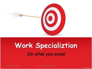 The document discusses various aspects of organizational design and structure. It begins by listing four presenters and their employee IDs. It then covers topics such as work specialization, organizational design elements like authority, departmentalization, chain of command, span of control and alternatives to specialization. The key aspects of work specialization include breaking down jobs into discrete tasks and having workers focus on specific skills. While specialization increases efficiency, it can also lead to monotony and loss of flexibility. The document discusses alternatives like job rotation, enlargement and enrichment to address the disadvantages.