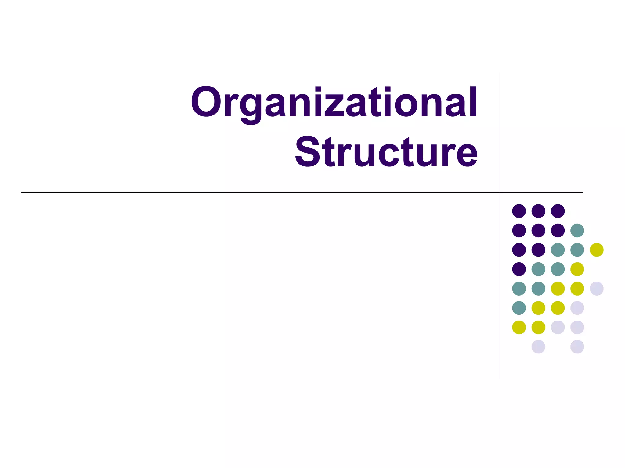 An organization's structure reveals who is responsible for what tasks, who communicates with whom, and the skill levels required for different positions. There are several types of organizational structures, including functional, divisional, and matrix structures. The document also discusses advantages and disadvantages of centralization versus decentralization, and different configuration and control processes within organizational structures.