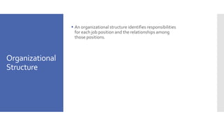 The document discusses organizational structure and how it varies among different firms. It describes how organizational structure identifies job responsibilities and relationships. It can be illustrated using organization charts. Structure can vary in terms of span of control, organizational height, and use of line and staff positions. It also discusses how authority is distributed through centralization, decentralization, and autonomy. The document outlines accountability through boards of directors and internal auditors. It describes structures like matrix organizations and intrapreneurship that allow more employee input. Finally, it discusses methods of departmentalizing tasks by function, product, location, and customer.