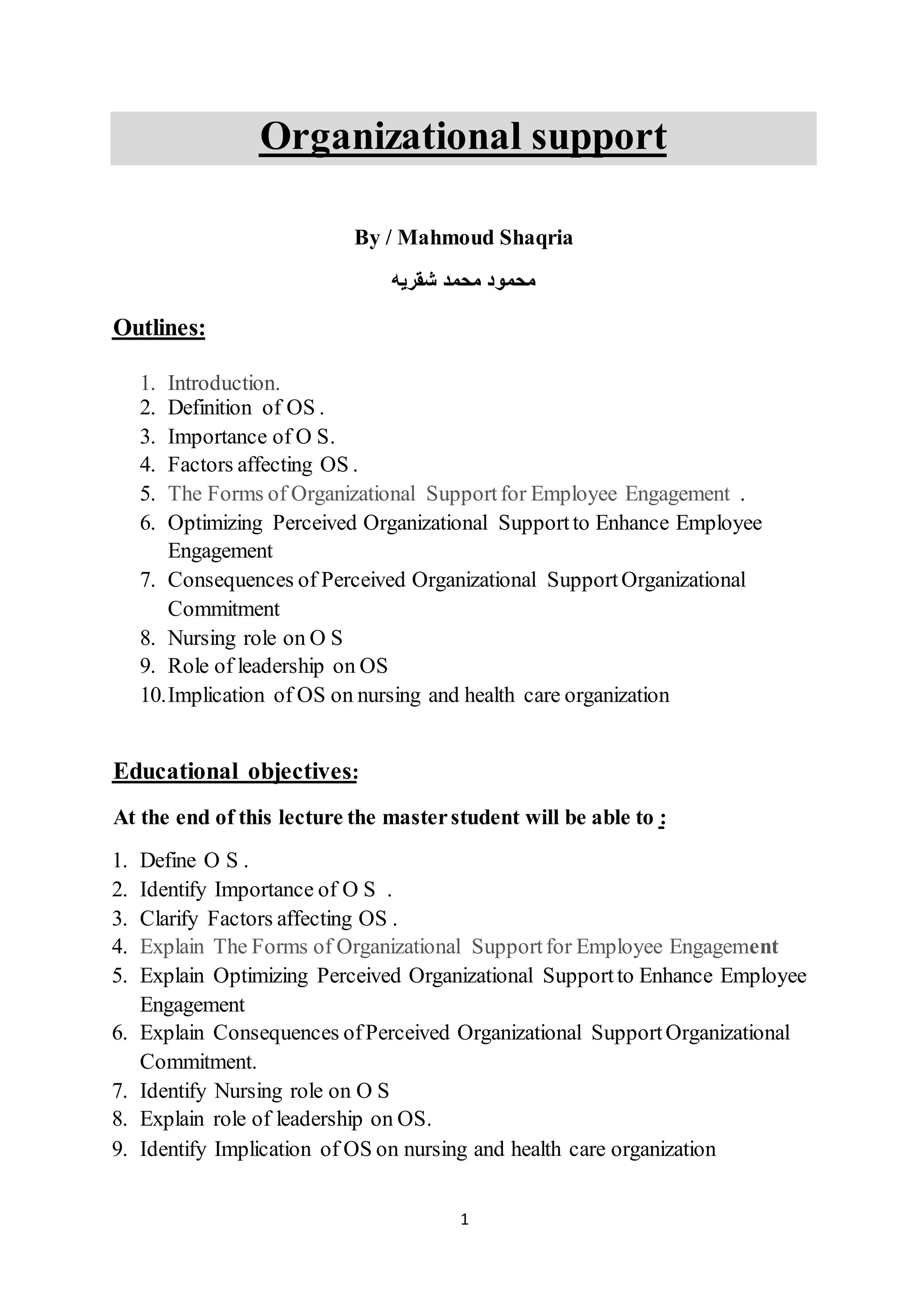 This document outlines a lecture on organizational support. It begins with defining organizational support as employees' beliefs about how much an organization values their contributions and cares about their well-being. It then discusses the importance of organizational support for employee engagement and commitment as well as factors that can influence organizational support like workload, resources, and manager support. The document also examines how different forms of support within an organization like from managers, colleagues, policies, and infrastructure can enhance employee engagement. It concludes by discussing the implications of organizational support for the nursing profession and healthcare organizations.