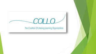 1. The Coalition of Lifelong Learning Organizations (COLLO) promotes continuing adult education, networking, and information exchange. It has programs like Tech Prep and supports federal literacy programs.