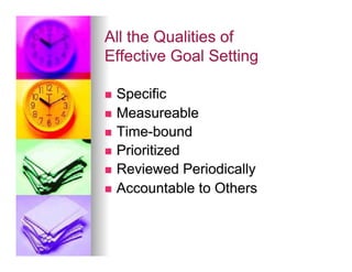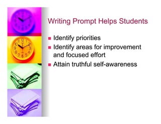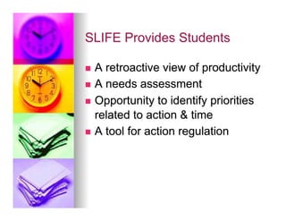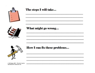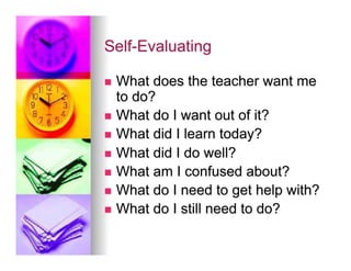 This document discusses helping students develop self-regulation skills for success. It defines self-regulated learning as when students are actively engaged in their own learning process. Key aspects of self-regulation include metacognition, strategic action, and motivation. The document also discusses how self-regulated learning involves goal setting, planning, self-monitoring, strategy use, and self-evaluation. While gifted students tend to be more self-regulated, there is variation, and lack of self-regulation can lead to underachievement. The document provides strategies for teachers to help students regulate their affect, behavior, and cognition.