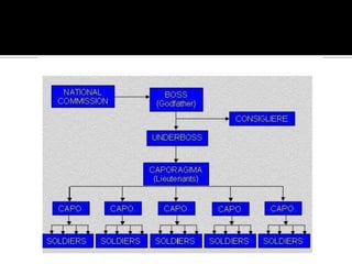 The document provides an overview of organized crime, specifically focusing on the history and structure of the American Mafia. It discusses how the Mafia originated in Sicily and was brought over by Italian immigrants to New York in the early 1900s. It grew significantly in power during Prohibition by bootlegging alcohol. The Commission was later formed to oversee the Five Families of New York. The document also outlines the hierarchy and rules of the Mafia family, their criminal activities, and the law enforcement response over time, including the use of the RICO Act and undercover operations like Donnie Brasco against the Mafia.