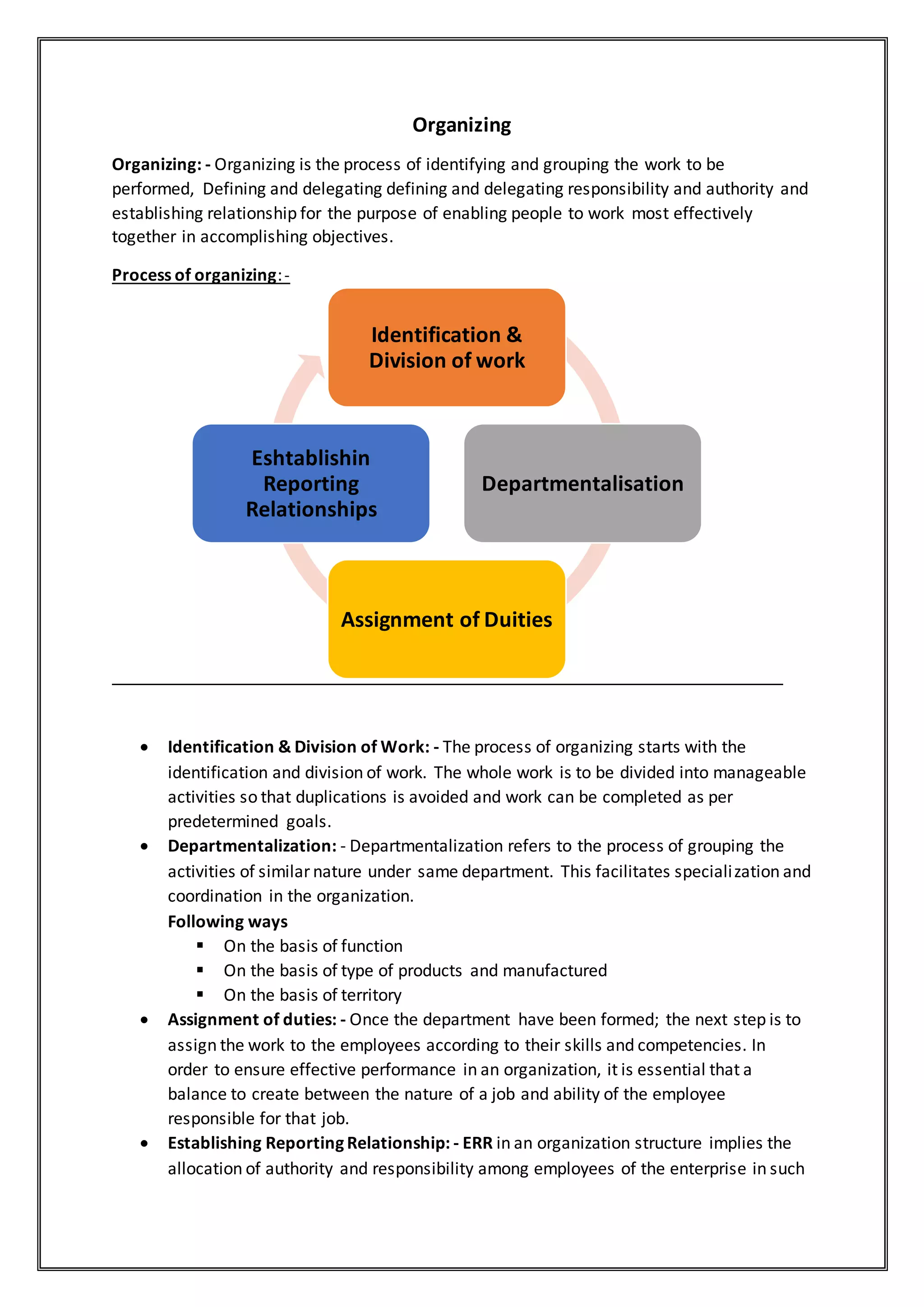 Organizing involves identifying and grouping work, defining responsibilities, and establishing relationships to enable effective teamwork towards objectives. The process includes work division, departmentalization, assignment of duties, and establishing reporting relationships, promoting specialization and clarity in roles. The importance of organizing lies in its ability to enhance efficiency, adapt to changes, ensure effective administration, develop personnel, and support organizational growth.