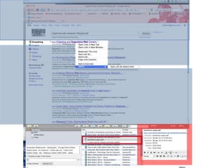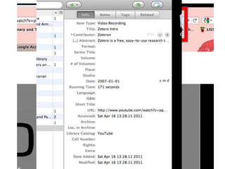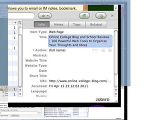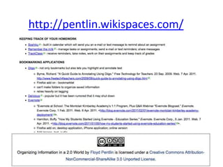 The document presents various tools and methods for organizing information in an increasingly digital world, particularly for students and librarians. It outlines resources for tracking homework, bookmarking, collecting information, and using organizational tools like Evernote and NoodleTools. Additionally, it provides links to videos and articles that offer further guidance on these topics.